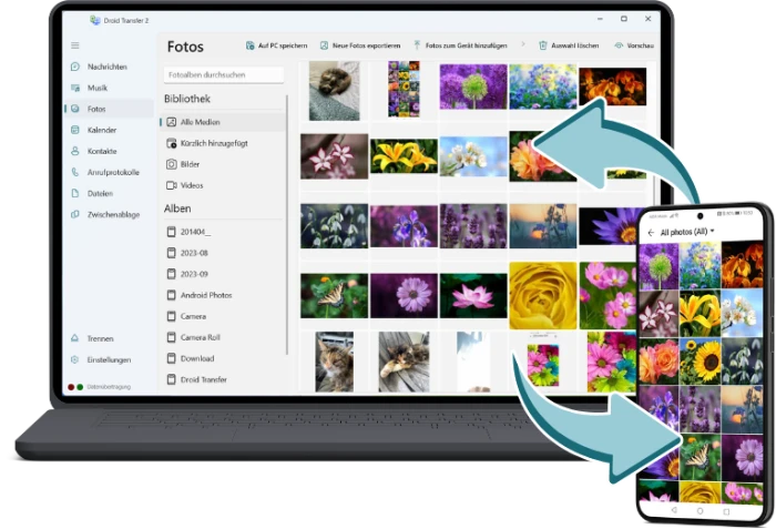 Droid Transfer ermöglicht es Ihnen, Fotos von Ihrem Android-Telefon auf Ihren Computer zu kopieren. Verwalten Sie Fotos auf Ihrem Android-Gerät über die intuitive und benutzerfreundliche Oberfläche von Droid Transfer. Sehen Sie sich die Fotosammlung Ihres Telefons an und kopieren Sie Fotos und Alben zur sicheren Aufbewahrung auf Ihren PC.