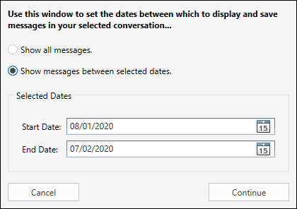 Sie können Ihre Nachrichten über die Schaltfläche „Daten filtern“ (PC) bzw. „Daten auswählen“ (Mac) in TouchCopy filtern. Durch Festlegen eines Datumsbereichs werden nur Nachrichten angezeigt, die innerhalb dieses Zeitraums gesendet/empfangen wurden.